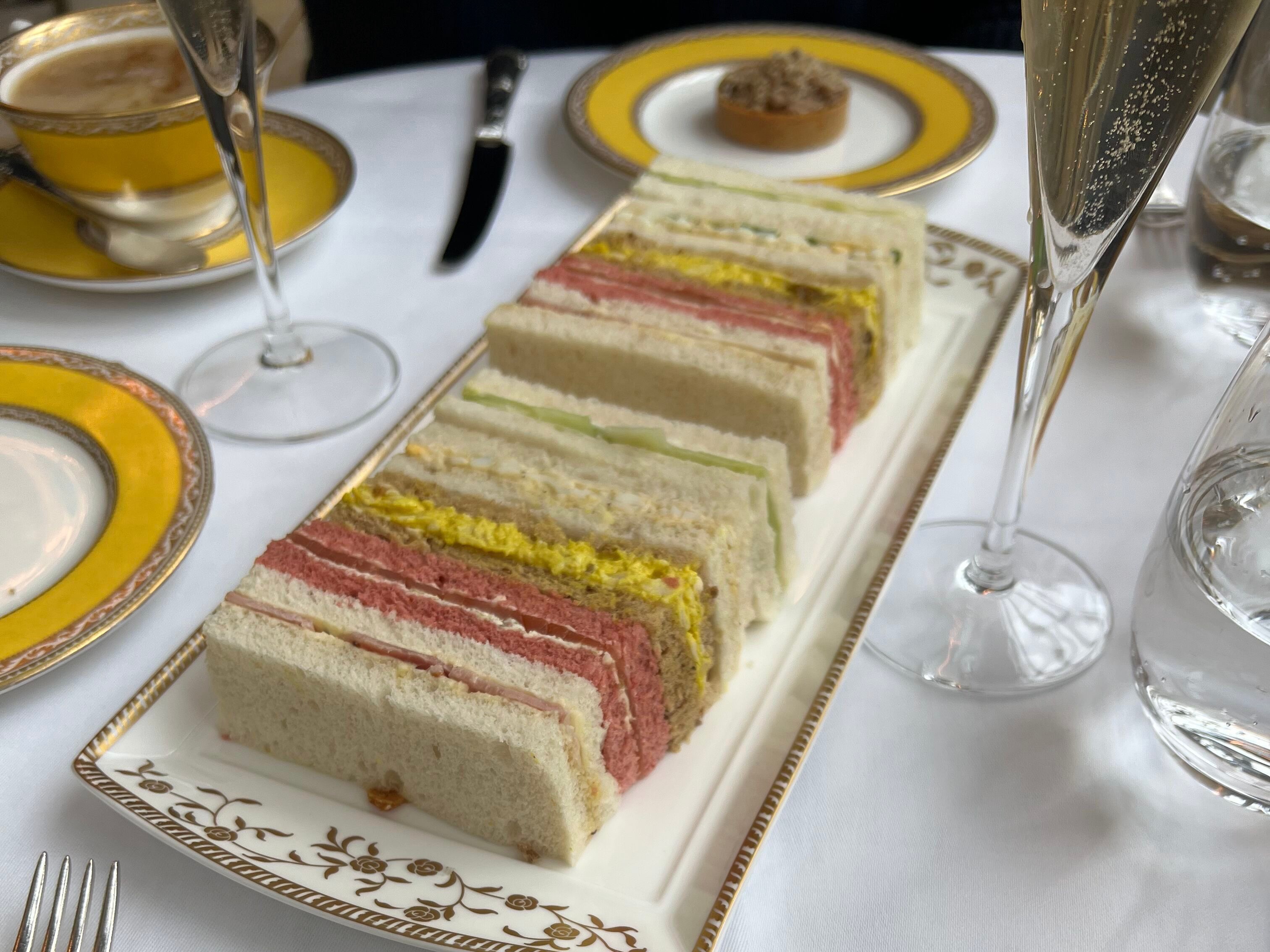 We chose The Goring’s own Afternoon Blend—malty, honeyed, and smooth, with just enough grip to stand up to warm scones and proper clotted cream. And because it felt like the right moment, a glass of Bollinger alongside. First came finger sandwiches, then warm scones (one plain, one fruit) with thick clotted cream and strawberry jam, and finally a sweet tier of miniature tarts, éclairs, and Victoria sponge.